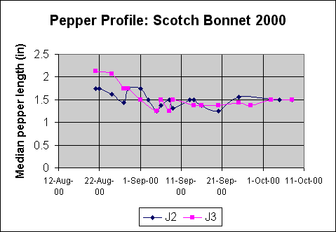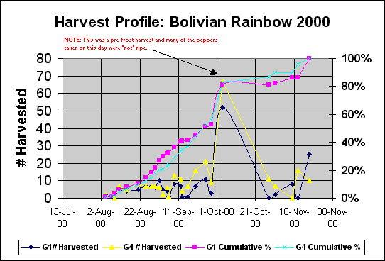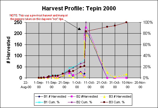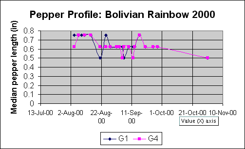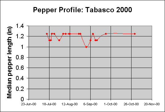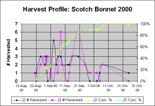 Data for one plant from 1999. Age at first harvest: 532d. Age at 50% harvest: 573d. Number of peppers harvested: 691. Average harvest size: 27 peppers.