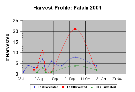 Data for three plants: F1, F2 and F3. Days to first harvest: 141, 154, 158. Avg = 151.0 d. Days to 50% harvest: 172, 192, 176. Avg = 180 d. Number of peppers harvested: 47, 42, 12. Average harvest size: 4.3 peppers, 6.0 peppers, 2.0 peppers.