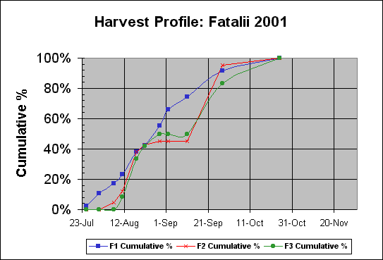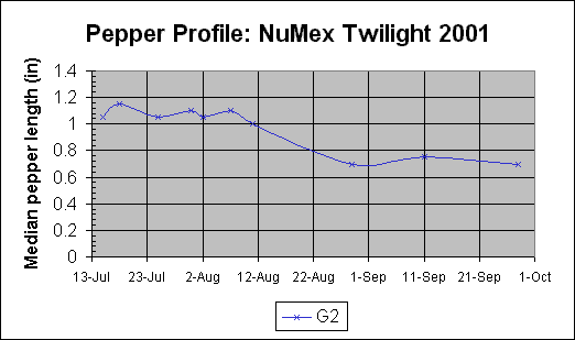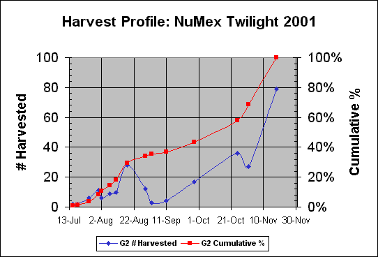 Data for one plant: G2. Days to first harvest: 131. Days to 50% harvest: 219. Number of peppers harvested: 252. Average harvest size: 16.8 peppers.