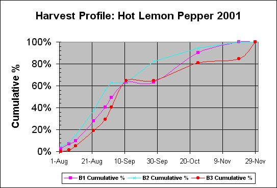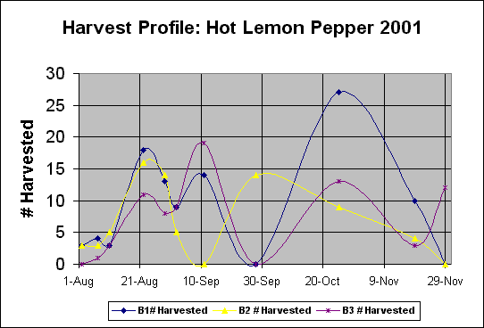 Data for three plants: B1, B2 and B3. Days to first harvest: 149, 149, 154. Avg = 150.7 d. Days to 50% harvest: 180, 172, 182. Avg = 178 d. Number of peppers harvested: 101, 73, 79. Avg = 84.3 Average harvest size: 11.2 peppers, 8.1 peppers, 8.8 peppers.
