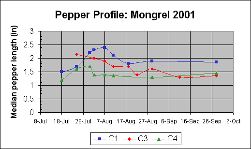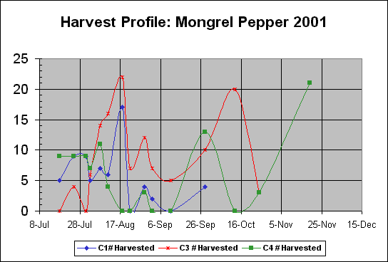 Data for three plants: C1, C3 and C4. Days to first harvest: 134, 141, 134. Days to 50% harvest: 154, 165, 154. Number of peppers harvested: 68, 126, 89. Average harvest size: 6.8 peppers, 10.5 peppers, 8.9 peppers.