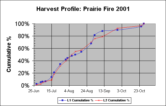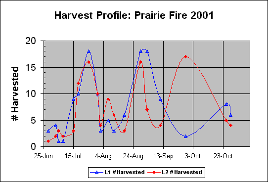 Data for two plants: L1 and L2. Days to first harvest: 114, 114. Avg = 114.0 d. Days to 50% harvest: 158, 154. Avg = 156.0 d. Number of peppers harvested: 134, 124. Avg = 129.0 peppers. Average harvest size: 7.4 peppers, 6.9 peppers.