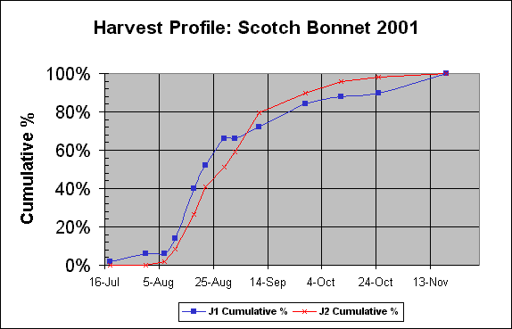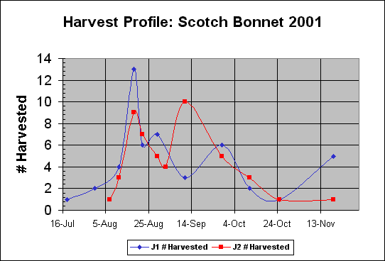 Data for two plants: J1 and J2. Days to first harvest: 134, 154. Avg = 144.0 d. Days to 50% harvest: 168, 175. Avg = 171.5 d. Number of peppers harvested: 50, 49. Avg = 49.5 peppers. Average harvest size: 4.5 peppers, 4.5 peppers.